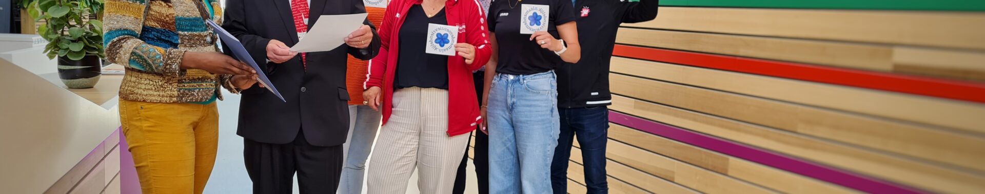 Hoe ga je om met iemand met dementie? De medewerkers van Alkmaar Sport zijn getraind in het herkennen van bezoekers en sporters met dementie en weten hoe zij deze personen het beste kunnen helpen. Uit handen van Ellen Verhaar-Vrede kregen zij woensdag 31 mei, namens Alzheimer Noord-Kennemerland, het certificaat ‘Samen dementievriendelijk’ overhandigd. Samen met wethouder Arie Epskamp namen zij een certificaat en bijbehorende stickers in ontvangst in sportcomplex De Meent.
